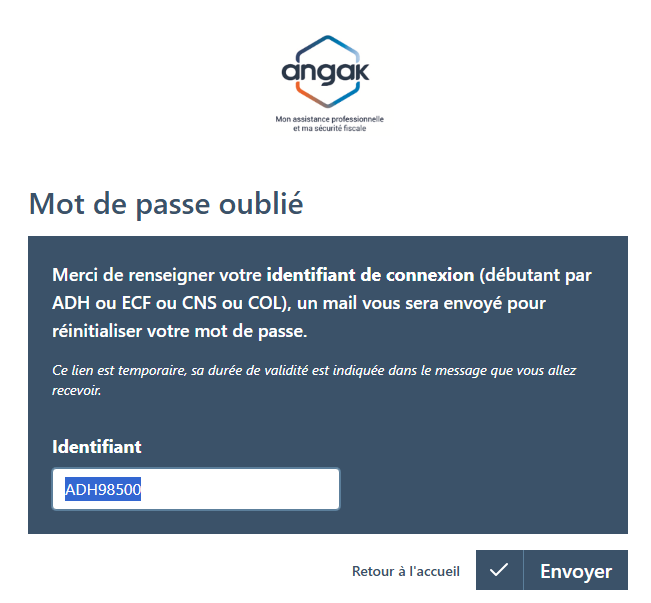 Sur cette nouvelle page il suffit de renseigner son numéro identifiant : ADH+numéro adhérent, puis cliquer sur Envoyer :