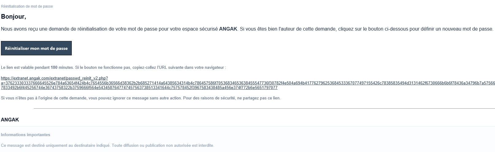 📧 Vous recevrez par mail (au mail rattaché à votre compte Angak), un lien permettant de choisir un nouveau mot de passe :